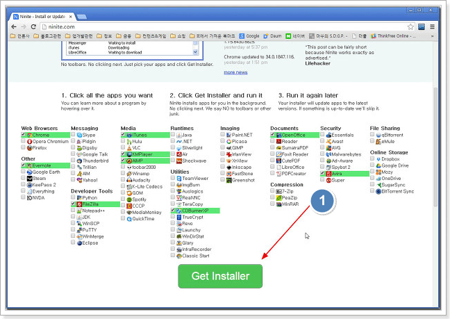자신이 설치할 프로그램을 클릭하여 선택하고 Get Installer를 클릭하며 선택된 프로그램을 한방에 설치할 수 있습니다